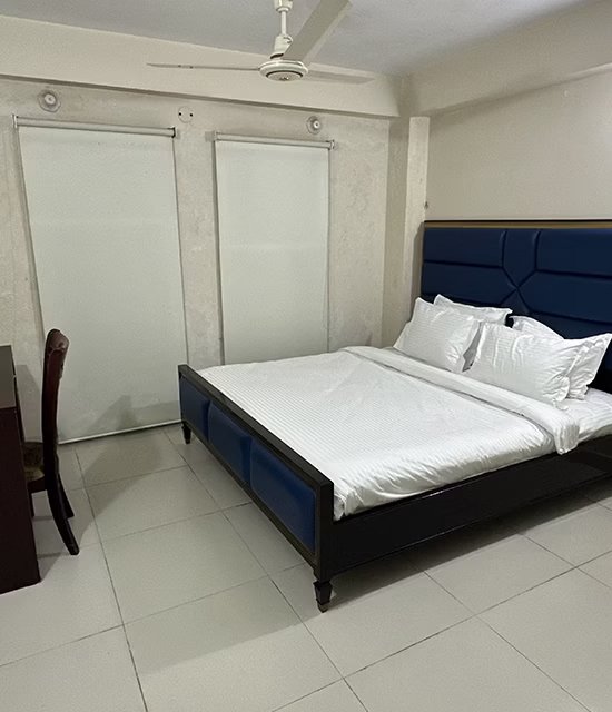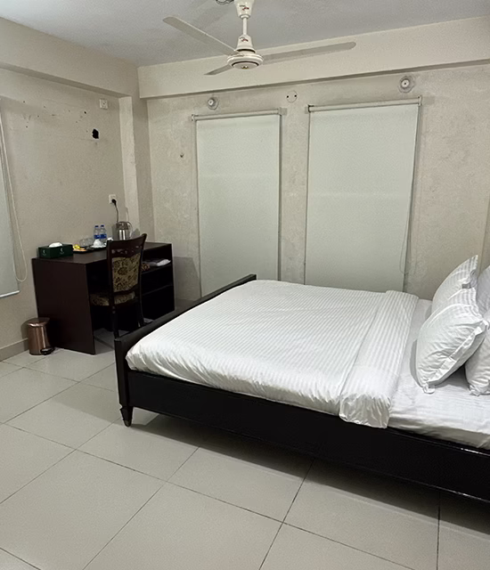 The room is spacious and well-appointed for ultimate relaxation. It features a luxurious king-size bed with premium fresh linens and a comfortable pillow set. An energy-efficient air conditioner ensures perfect climate control, while a smart flat-screen TV with Wi-Fi connectivity provides entertainment. Elegant curtains, a pleasant air freshener, and tastefully curated décor—including indoor plants and wall art—create a warm and inviting environment. The layout also allows easy wheelchair access for added convenience.