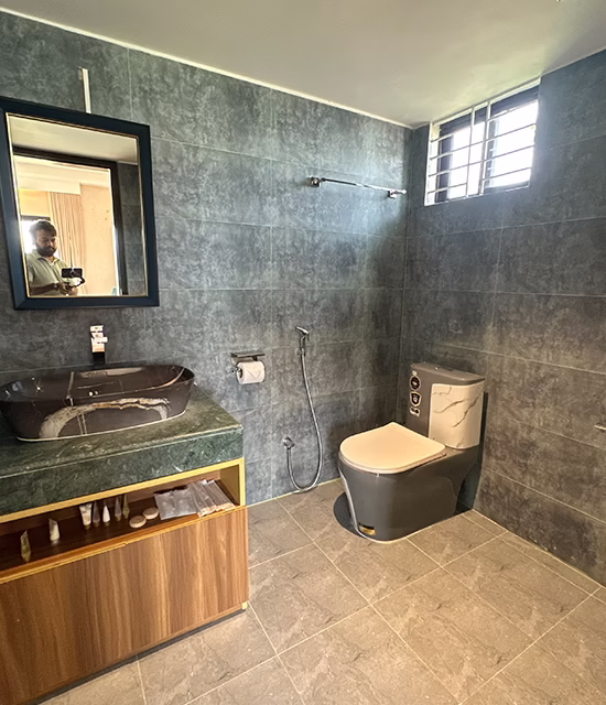 The room features a clean, modern, and fully equipped bathroom designed for comfort and convenience. Guests can enjoy uninterrupted hot and cold water through a geyser system, along with a hair dryer and a large mirror. A complete guest toiletries kit is provided, including shampoo, shower gel, soap, toothbrush, toothpaste, and tissue. Fresh bath, face, and hand towels with a floor mat are included, complemented by premium comforts such as bathrobes, slippers, and a personal locker facility for valuables.