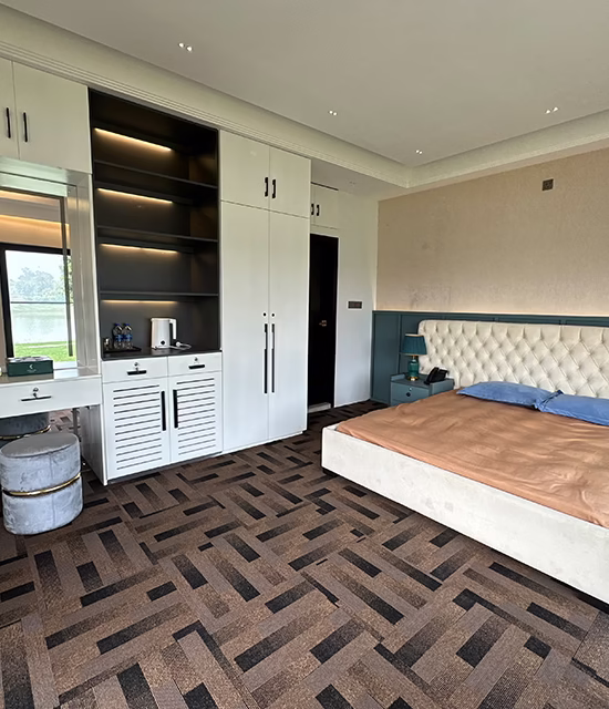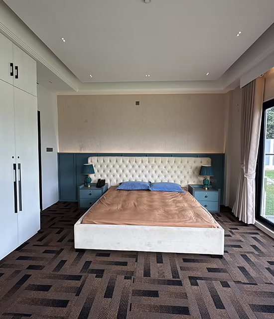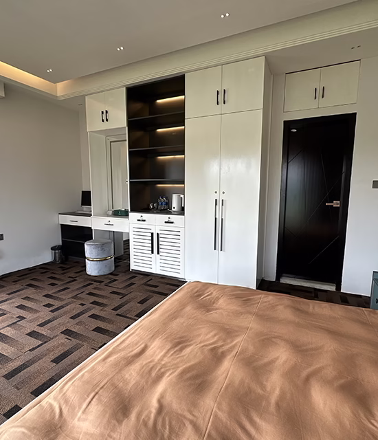 The room is thoughtfully arranged to provide a calm and comfortable living experience. It features a spacious king-size bed with a soft mattress, premium linens, and cozy pillows for restful sleep. An efficient air conditioning system ensures comfort throughout all seasons, while a smart LED TV with internet access offers entertainment at your convenience.